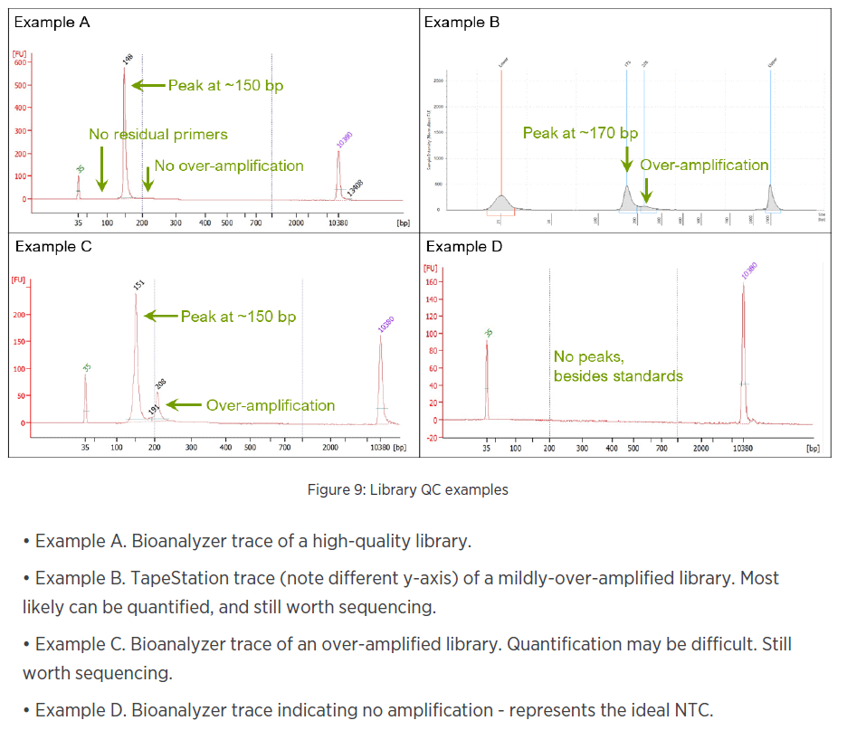 We recommend assessing library quality on a capillary electrophoresis device such as the Agilent Bioanlayzer or similar to check amplicon size, concentration, and absence of contaminating primers. It is helpful to assess the library at stock concentration, in a dilution and checking the NTC library.